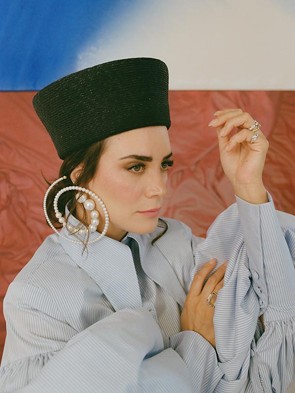 Blazer by BALENCIAGA. Hat by MARYAM KEYHANI. Shoes by LOEWE. Bracelet and rings by ONI STUDIO. Necklace and green ring by YASEMIN MENTES.