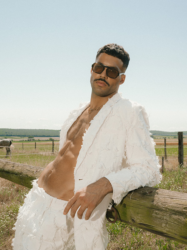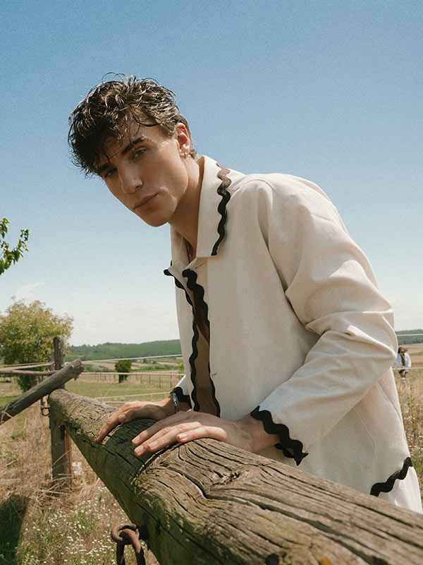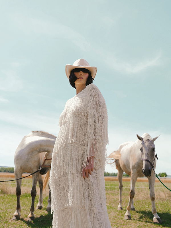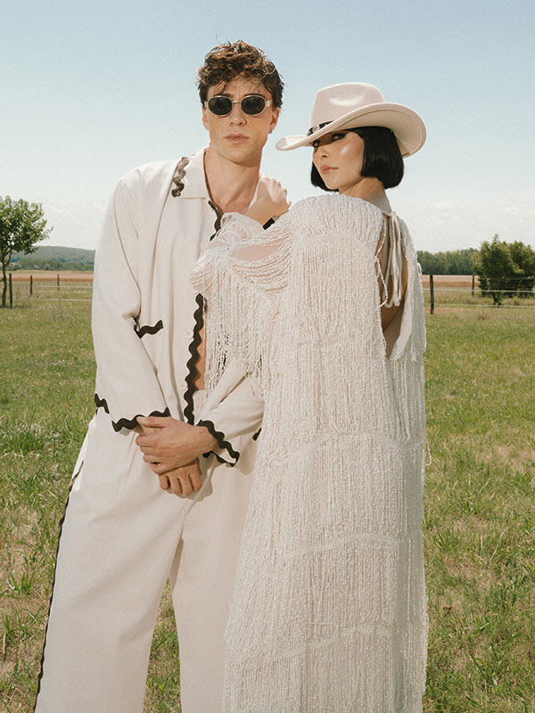 Two-piece linen suit with decorative stripes by RECLAIMED VINTAGE, dress with beaded fringing by FEMME MAISON.