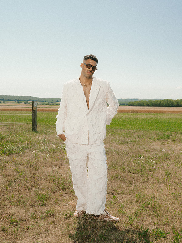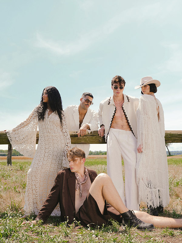 Lace dress with tropical sleeves by FEMME MAISON, Two-piece fringed suit by RECLAIMED VINTAGE, Oversize suit with Bermuda shorts by RECLAIMED VINTAGE, Two-piece linen suit with decorative stripes by RECLAIMED VINTAGE, Dress with beaded fringes by FEMME MAISON