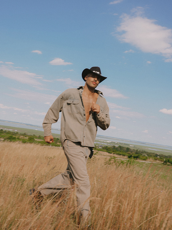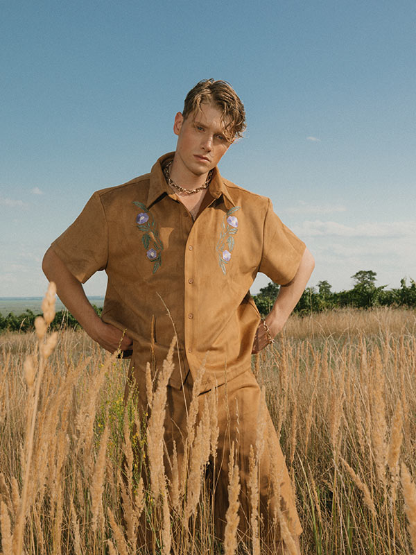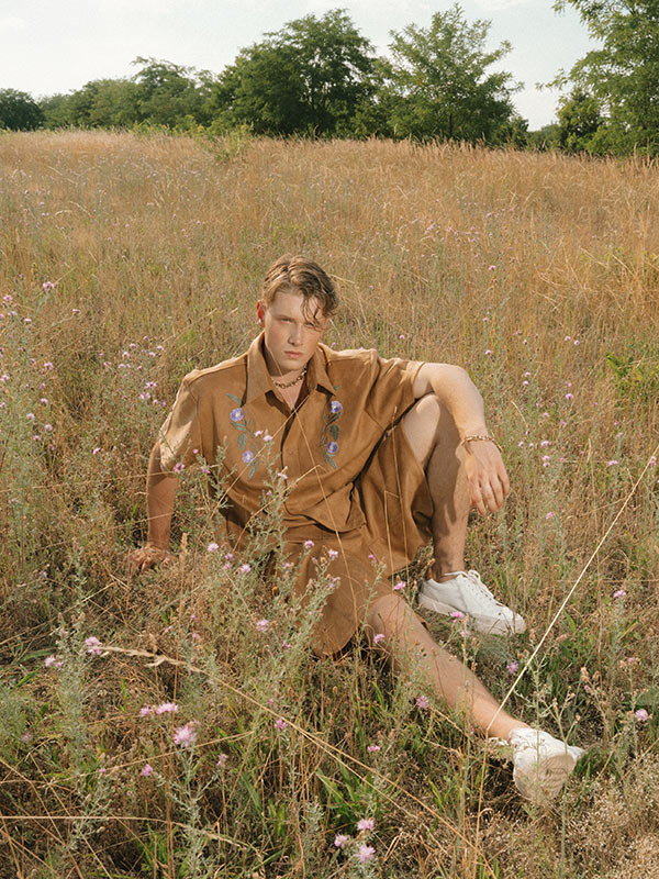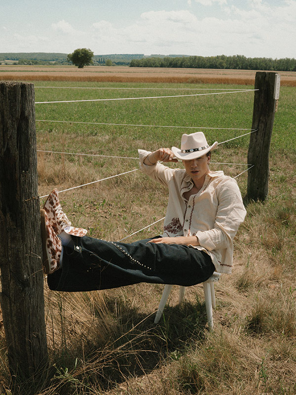 Two-piece suede shirt and shorts set by RECLAIMED VINTAGE, Denim jumpsuit by SEVEN FOR ALL MANKIND, Two-piece denim shirt and jeans set by CARHARTT, Suede jacket with fringes by CHRIST, Denim with floral embroidery by DOROTHEE SCHUMACHER