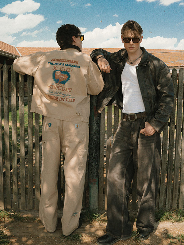 Two-piece set comprising jacket and trousers by CARHARTT, lightwash denim by LEVI’S, genuine leather trucker jacket by RECLAIMED VINTAGE.