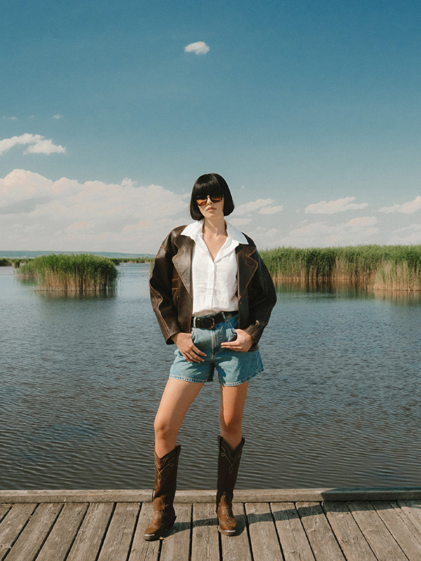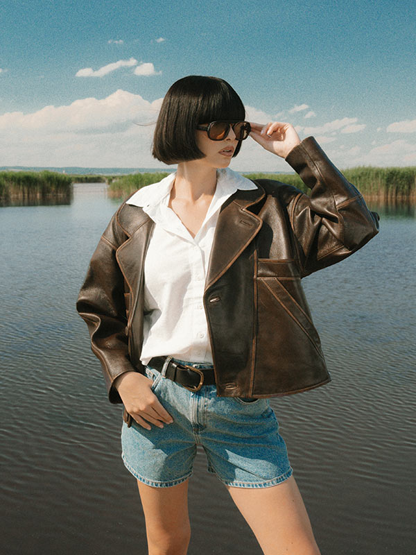 Leather jacket by SANDRO, linen shirt by ARKET, denim shorts by LEVIS.