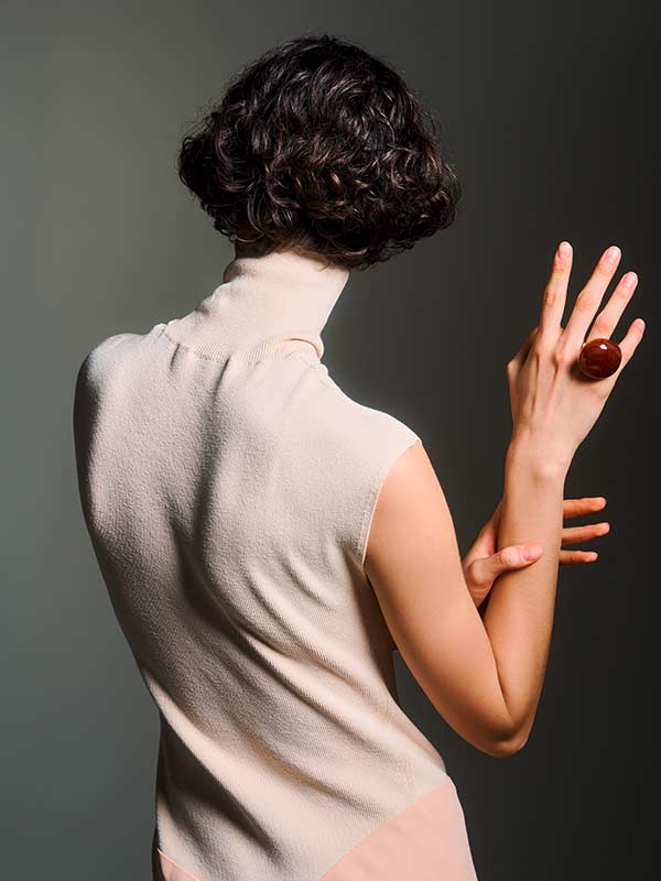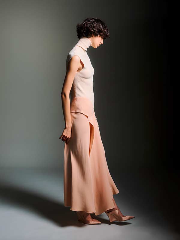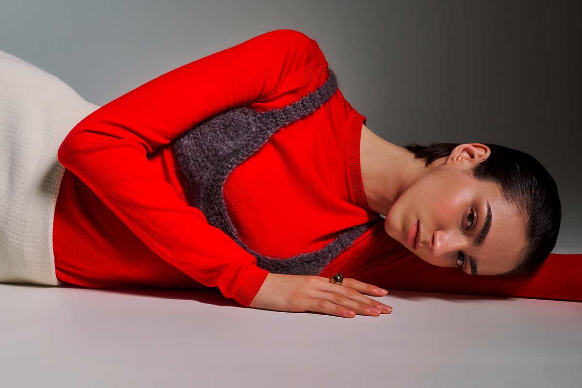 Cardigan and skirt from ET OCHS. Knitted bra from STYLIST’S OWN. Long sleeves by PRADA. Pumps from ARKET. Ring by MARIA BLACK.