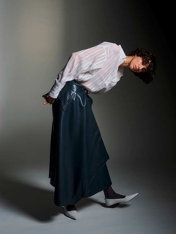 Shirt from REMAIN. Skirt from NANUSHKA. Tights from FALKE. Pumps from VAGABO ND.