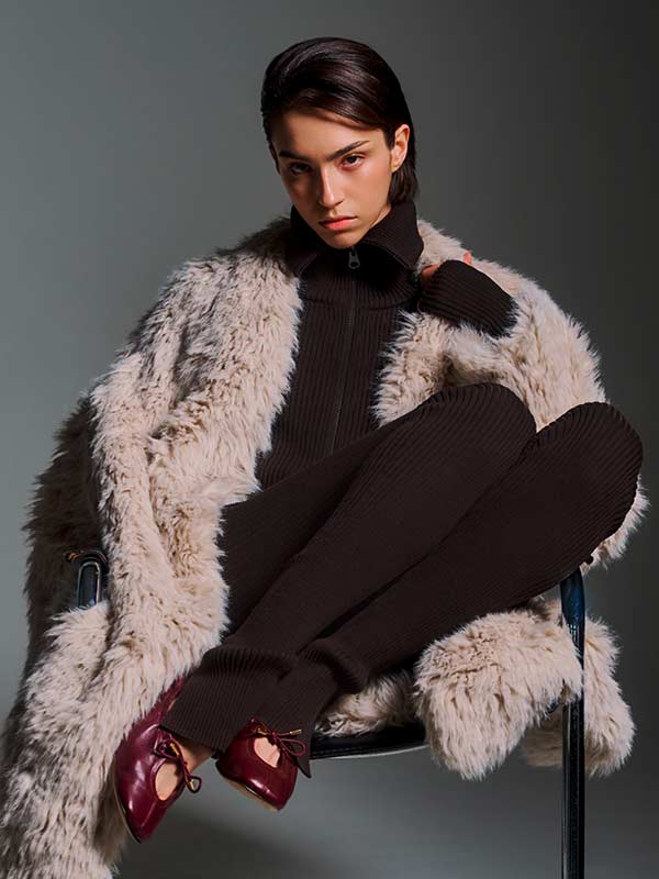 Fake fur coat from &OTHER STORIES. Cardigan and leggings from ARKET. Ballerinas from SCAROSSO.