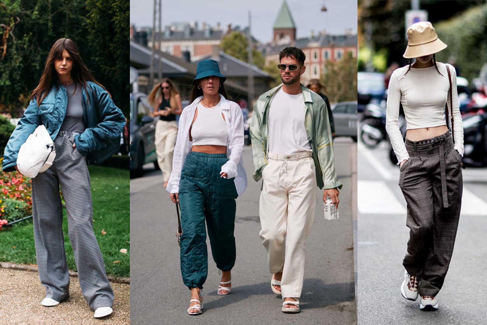 . Combined with crop tops, the wide-leg pants create a look that is still pretty trendy today. Another piece that will never die out: the bucket hat. We now see it in many colors and variations on numerous heads.