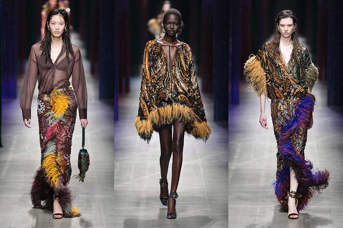 Paisley remains the centerpiece, larger, stronger, charged with sequins – surfaces that catch the light. Feathers add movement and tactility, line edges, frame scarves and drape over skirts and dresses with controlled drama.