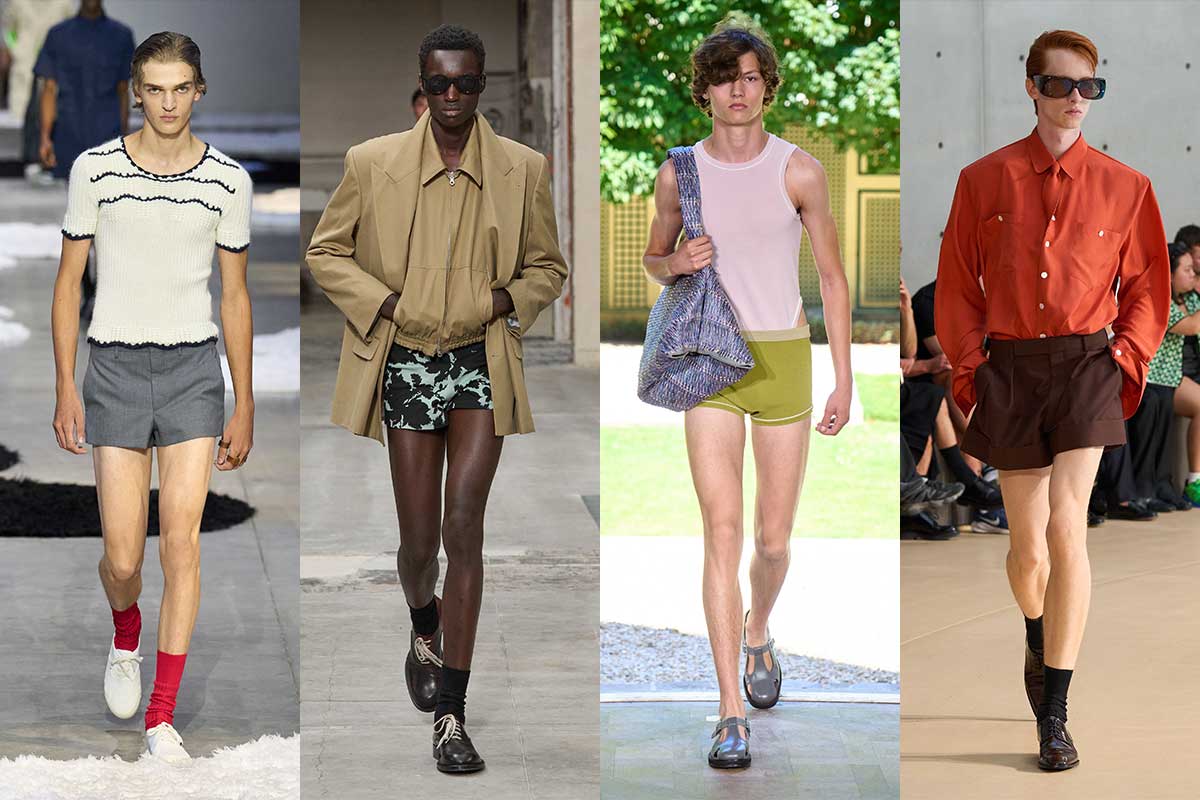 Ralph Lauren on the ranch, a young Schwarzenegger on Venice Beach, Björn Borg on the center court: the upcoming menswear refreshes these iconic looks. Thanks to micro shorts combined with tucked knitwear, oversized blazers, outerwear and school socks. Our highlight: Julian Klausner at Dries Van Noten delivers the almost painfully short, kicky print shorts.
