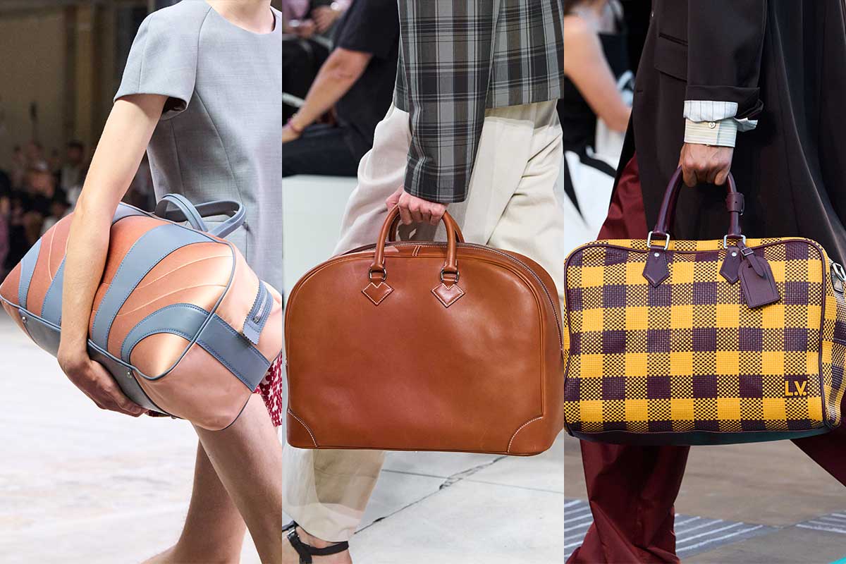 Thank god it’s Friday! The weekender bag is themen’s bag for SS26. Our highlight: Dries Van Noten’s sculpted weekender in peach brown and slate blue leather – for all retro-futurists.