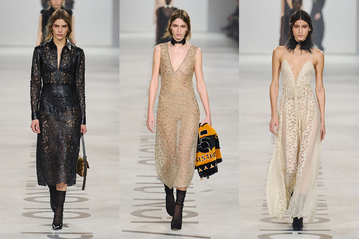 Womenswear is characterized by elongated silhouettes and controlled proportions. Lace – traditionally associated with romance – is disciplined into black Chantilly column dresses. Transparency appears, but never loose; leather inserts structure the body, while chokers frame the neck. The interplay of masculine severity and feminine delicacy is reminiscent of the codes of Karl Lagerfeld’s Fendi. Fur, central to Fendi’s DNA, frames collars and gilets with restraint rather than excess. Evening looks in shades of sand and muted gold are deliberately set rather than decorative. The result is a femininity defined by self-assurance rather than fragility – unmistakably Chiuri.