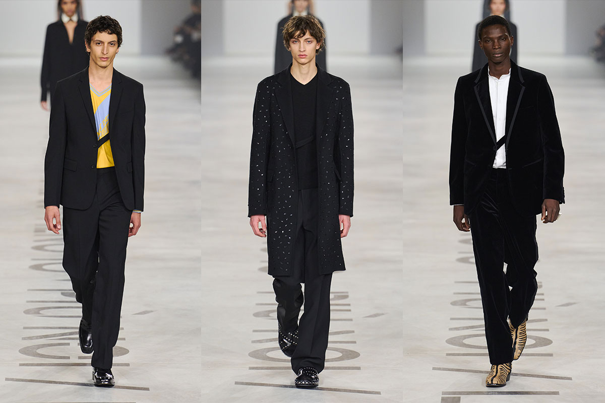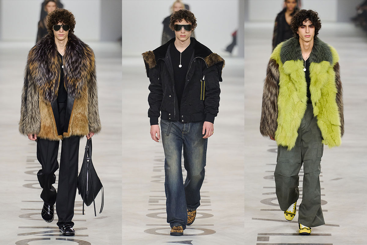 Menswear focuses on outerwear and precise tailoring. Suits are cut slim and elongated, close to the body, while fur coats emphasize Fendi’s material tradition. Parkas and black, tailored overcoats bring urban restraint into the picture. At first glance, the mood seems almost reserved. But the detail is on the ground: The footwear becomes a statement. Zebra-striped boots, contrasting low-profile sneakers and studded leather sandals shift the tone from classic to disruptive and break the austerity of tailoring.