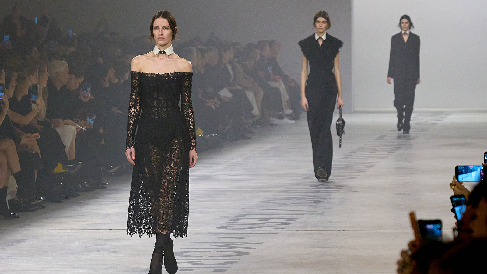 The Fendi Fall/Winter 2026/27 collection marks the return of Maria Grazia Chiuri to the house where her career began – now as Chief Creative Director. For the 80 looks, structure shaped the silhouette, with elongated proportions and surface details replacing volume as the central element. Fendi, long associated with rich colors and material opulence, reduced its palette this season. “Black – the new color.” It functions as a foundation, sharpens the tailoring, intensifies lace and makes the construction visible. The direction is clear: reduction as a strategy.