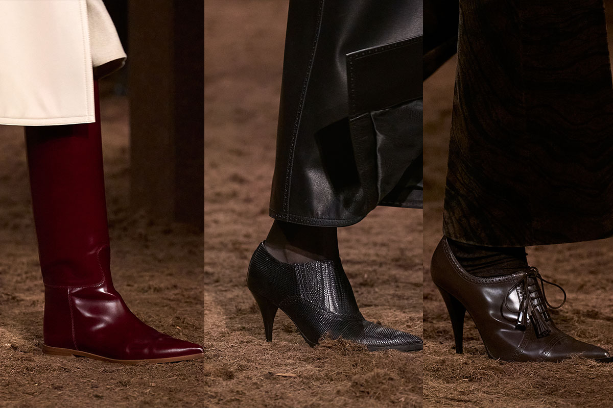 Knee-high riding boots made from soft leather add a classic finishing touch to the collection – their elongated shape harmonizes perfectly with the structured looks above. Tapered ankle boots and lace-up heels provide an edgy contrast and balance strength with elegance. Textured surfaces and sculptural heels make a modern statement: nothing is left to chance here – but don’t play it safe either.