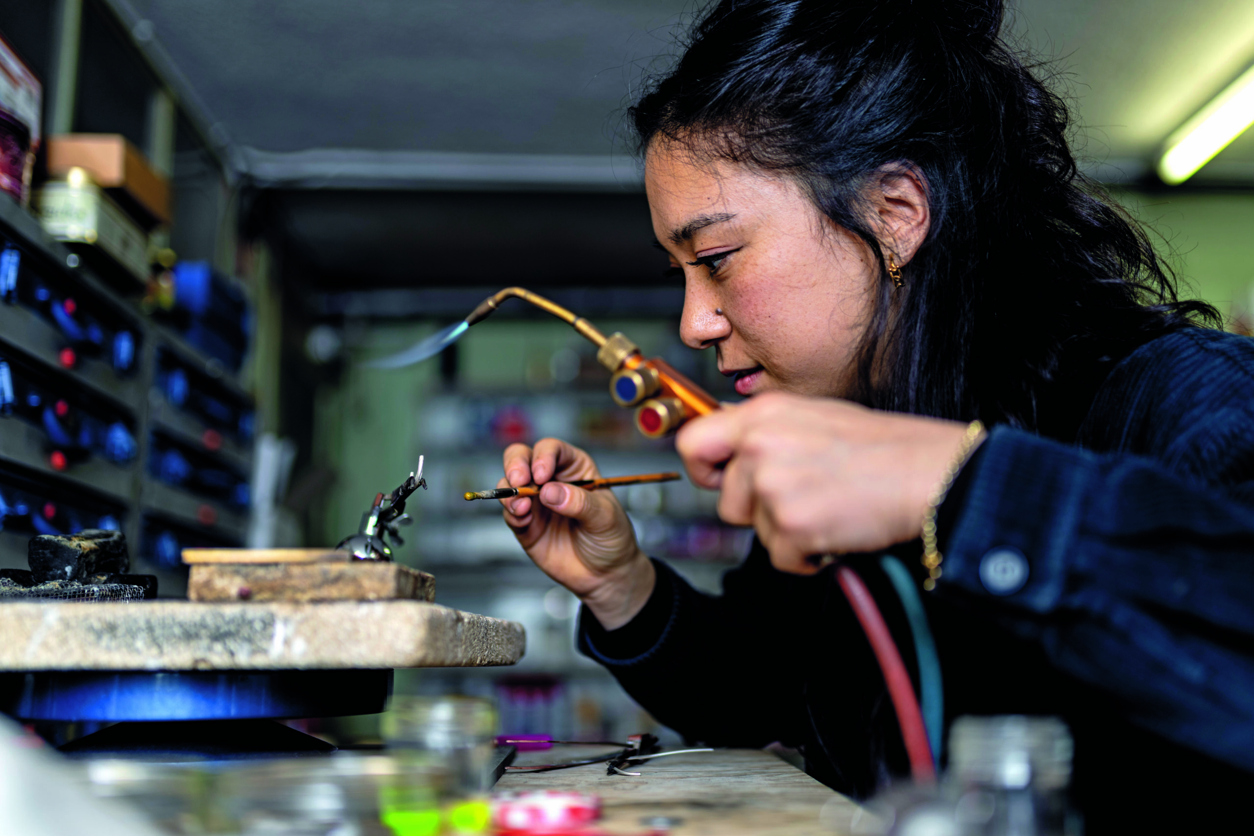 Hammering, filing, polishing. This requires patience and a keen instinct. But even more: passion, and this has infected Nicole Hana Kim ever since she created jewelry for the first time in a course. This led to her own label, Hana Kim, for which she produces pieces that not only look pretty, but also score highly in terms of sustainability.
