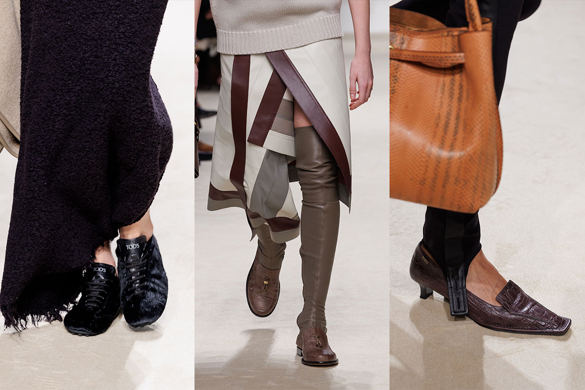 Tod’s is moving away from slipper-like nonchalance and towards a clearer, more urban presence – quiet, but no longer reserved. The Gommino sneaker appears in soft, textured versions. Loafers become more architectural, with a more angular toe section, croco embossing and sculptural mid-heels. A loafer-boot fusion brings an elongated, slightly equestrian-inspired line.