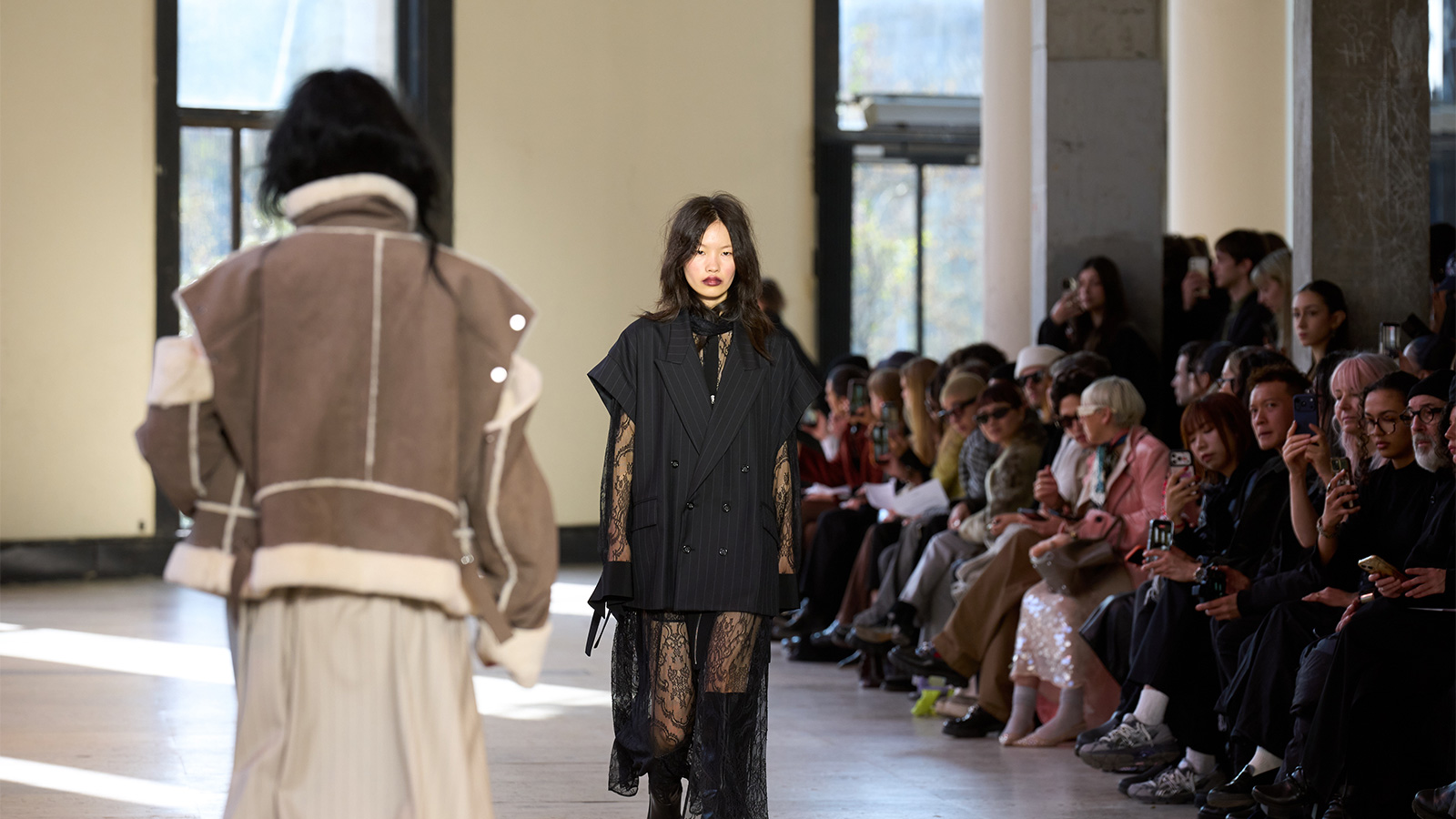 The collection revolves around the idea of antithesis: structure meets softness, discipline meets lightness. The precision in the cut remains visible, but the silhouettes appear more relaxed and move between elegance and a slight disorder. Materials play a central role here. Some fabrics are produced in Japan on a Schönherr loom from the 1960s, which works five times slower than modern machines and gives the textiles a dense, almost tangible quality. Faux-suede and faux-fur appear in aviator jackets, while lace makes a surprise appearance under textured layers. Check patterns bring in a subtle 90s grunge vibe, and a dark palette of black, chocolate and rosewood is broken up by accents of fern green and fig.
