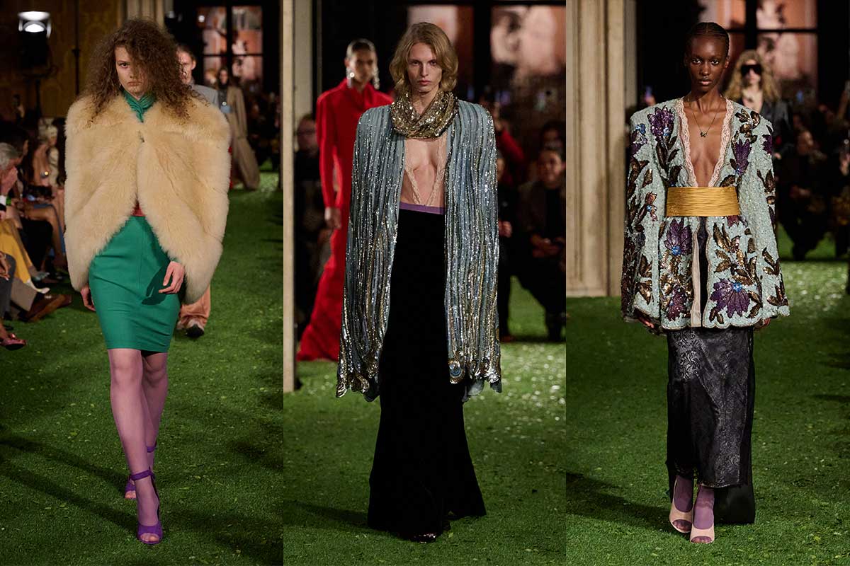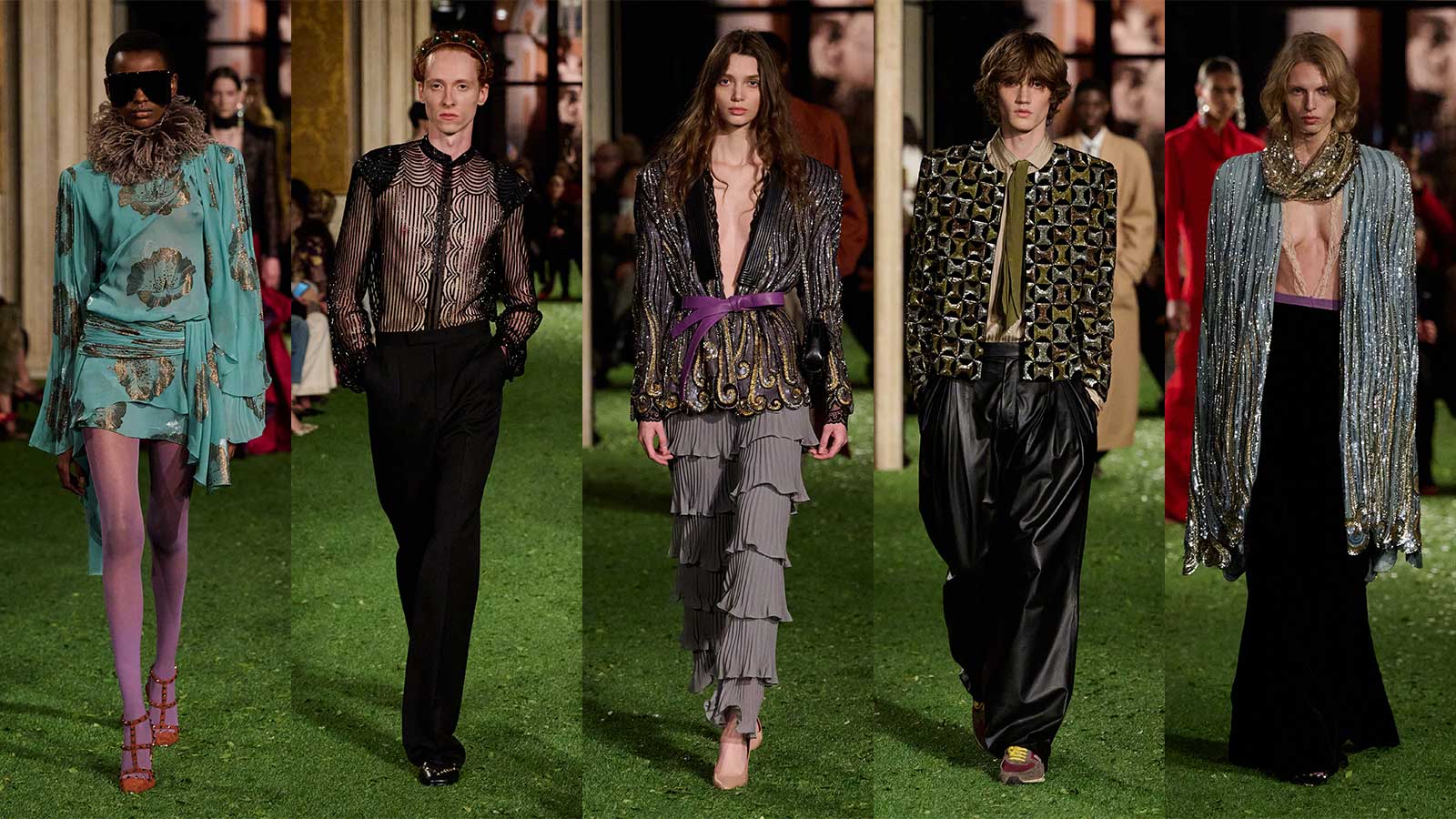 Womenswear balances structure and opulence. Leather jackets and furs add a dramatic presence, while sculptural jackets and flowing dresses shape the silhouette. Pleated tunics, sequins, lace and jewel-colored velvets are layered over the looks, creating a dense surface of ornamentation. Transparency, embellishments and soft draping move between elegance and theatrical excess.