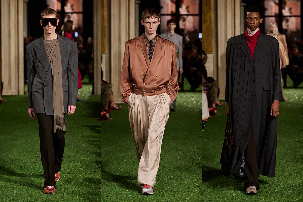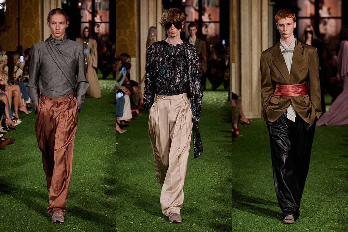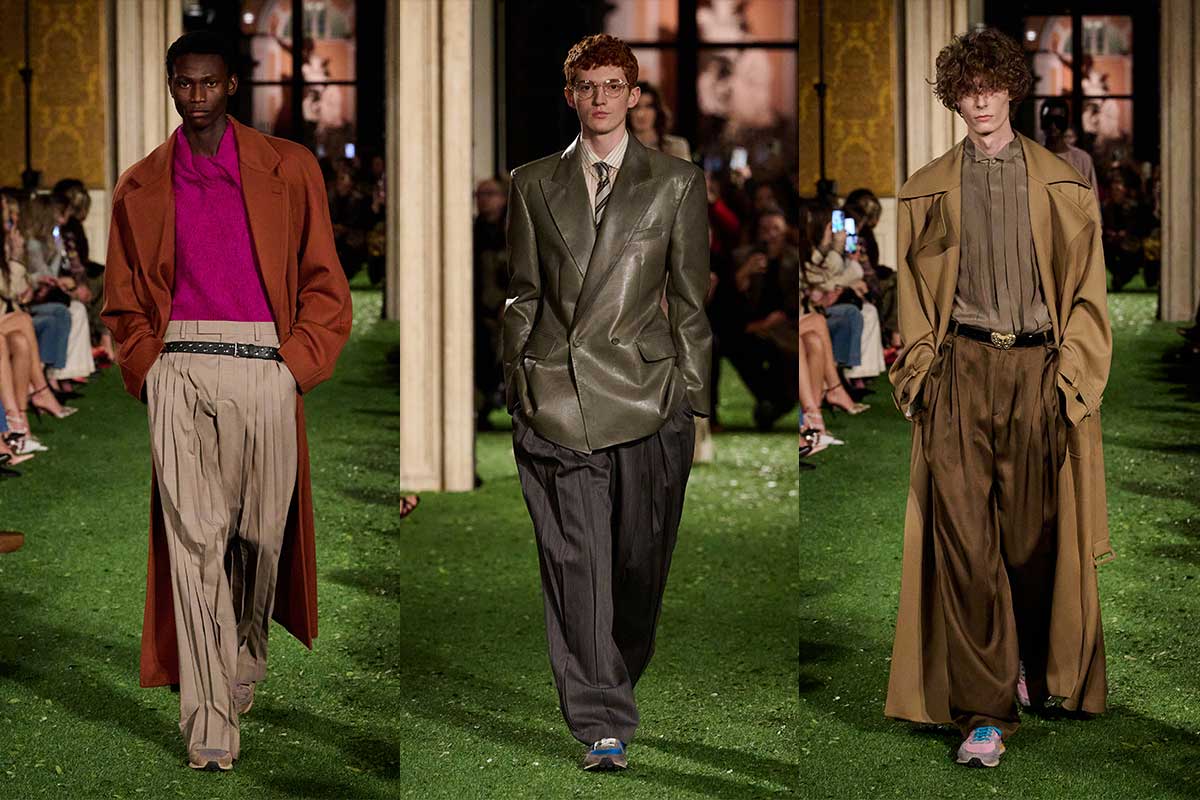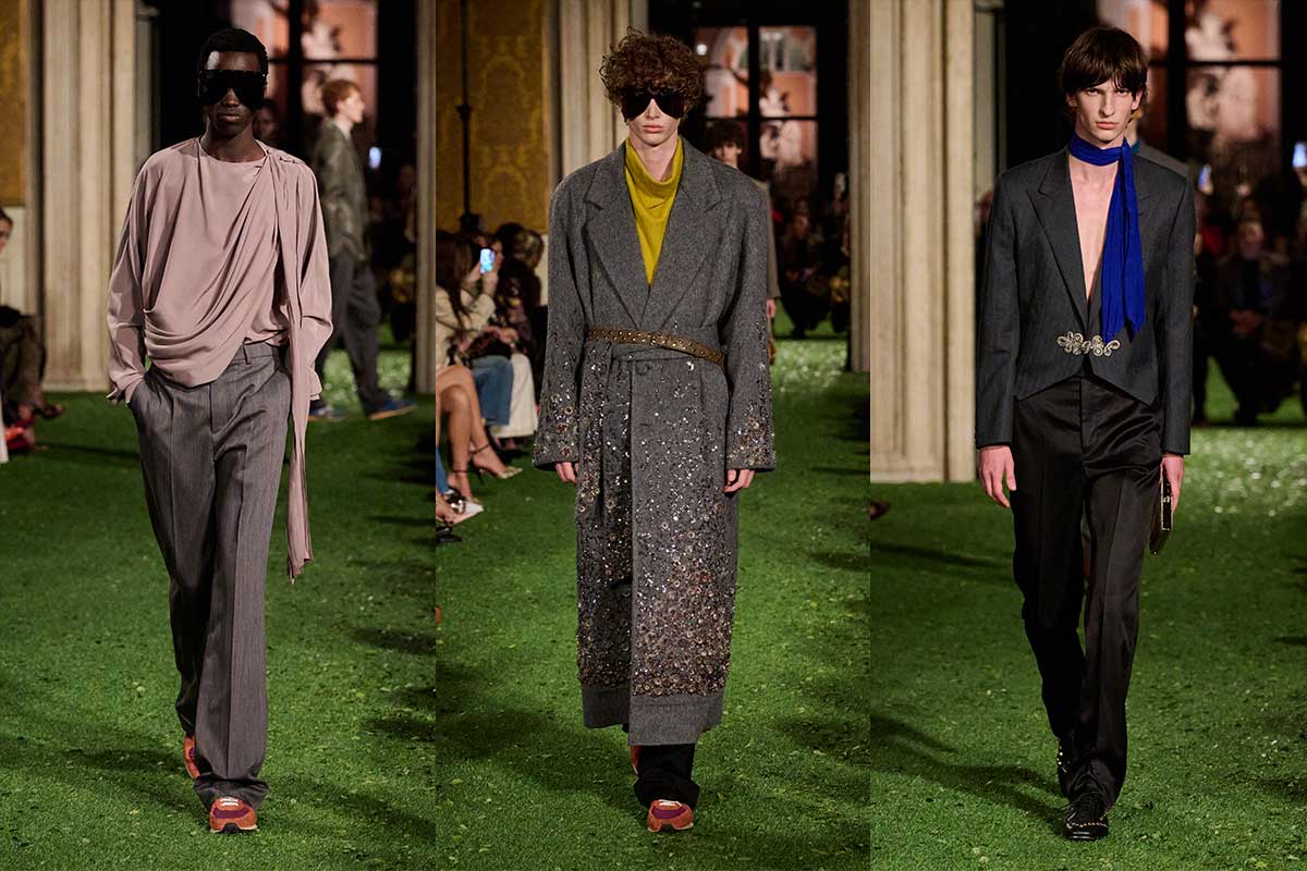 The menswear initially appears more restrained, but is by no means boring. Soft tailoring, high-waisted pleated pants and long coats create elongated silhouettes that move with ease. The color palette remains predominantly muted – anthracite, camel and olive – punctuated by pops of color in scarves and knit layers. Satin belts, draped necklines and textured fabrics nevertheless bring Michele’s decorative signature into play.