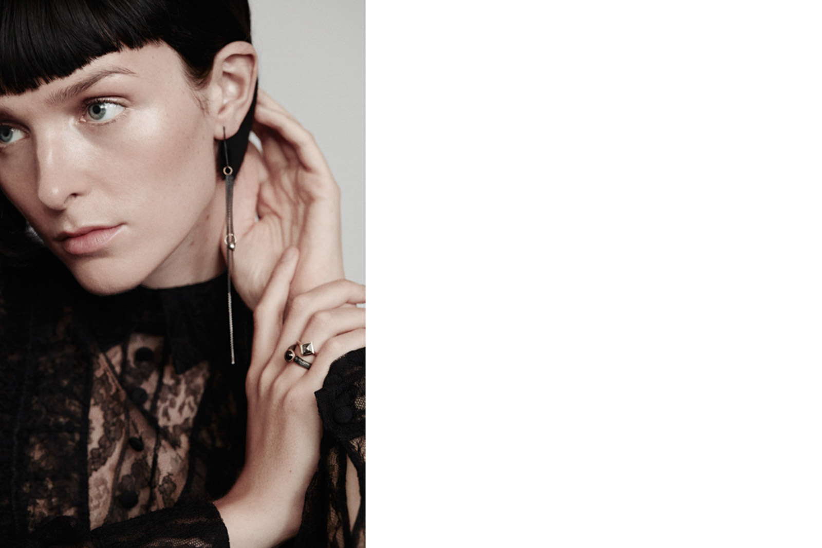 Jewelry from DRIES VAN NOTEN. Rings from SWAROVSKI.